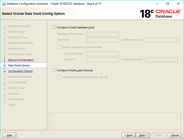 DBCA 8: Select Database Options – Only available if Custom Database Creation template is chosen in Screen 3.